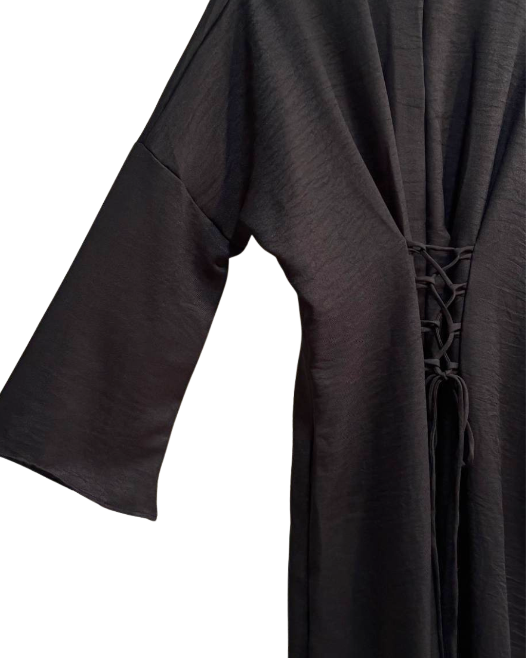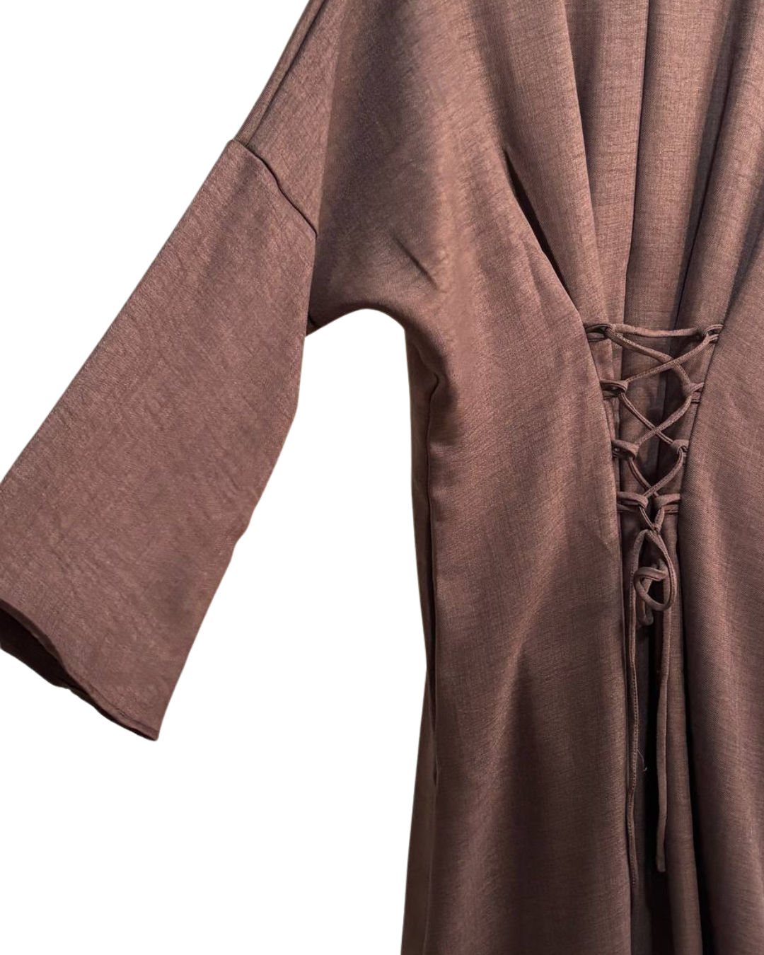 - Design: String loops, matching string, zip at the back, flare sleeves, cinched waist